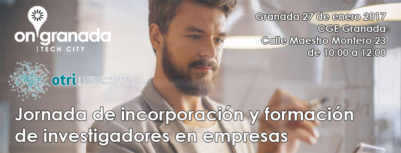 La Oficina de Transferencia de Resultados de Invstigación (OTRI) de la UGR y la Asociación Clúster Granada Plaza Tecnológica y Biotecnológica, onGranada Tech City, organizarán el próximo viernes 27 de enero en nuestra sede de la CGE (Calle Maestro Montero 23) una jornada sobre la incorporación y formación de investigadores en empresas. El encuentro dará comienzo a las 10.00 y tendrá una duración estimada de dos horas, estará dirigido a empresas, asociaciones empresariales, alumnos y profesorado de doctorado.